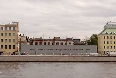 © Юлий Рыбаков / Facebook В среду, 3 августа, на Пироговской набережной в Петербурге был вывешен баннер с фразой «Вы распинаете свободу, но душа человека не знает оков!», которую ровно 40 лет назад написали на стене Петропавловской крепости ленинградские диссиденты Юлий Рыбаков и Олег Волков.