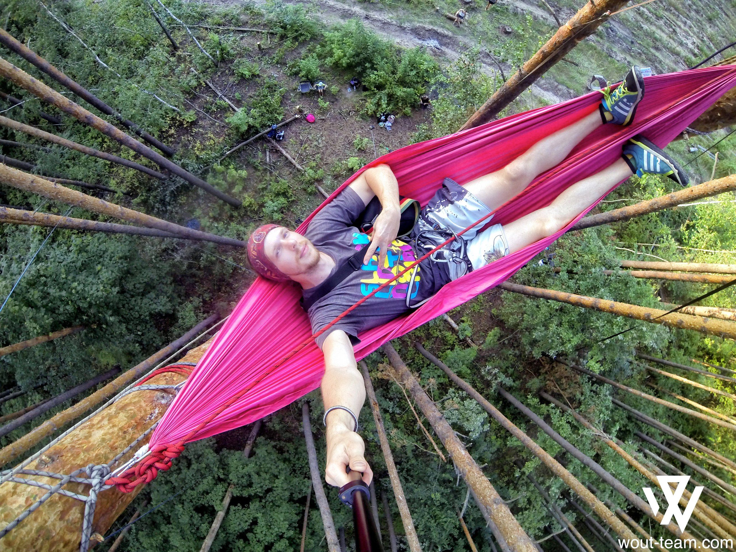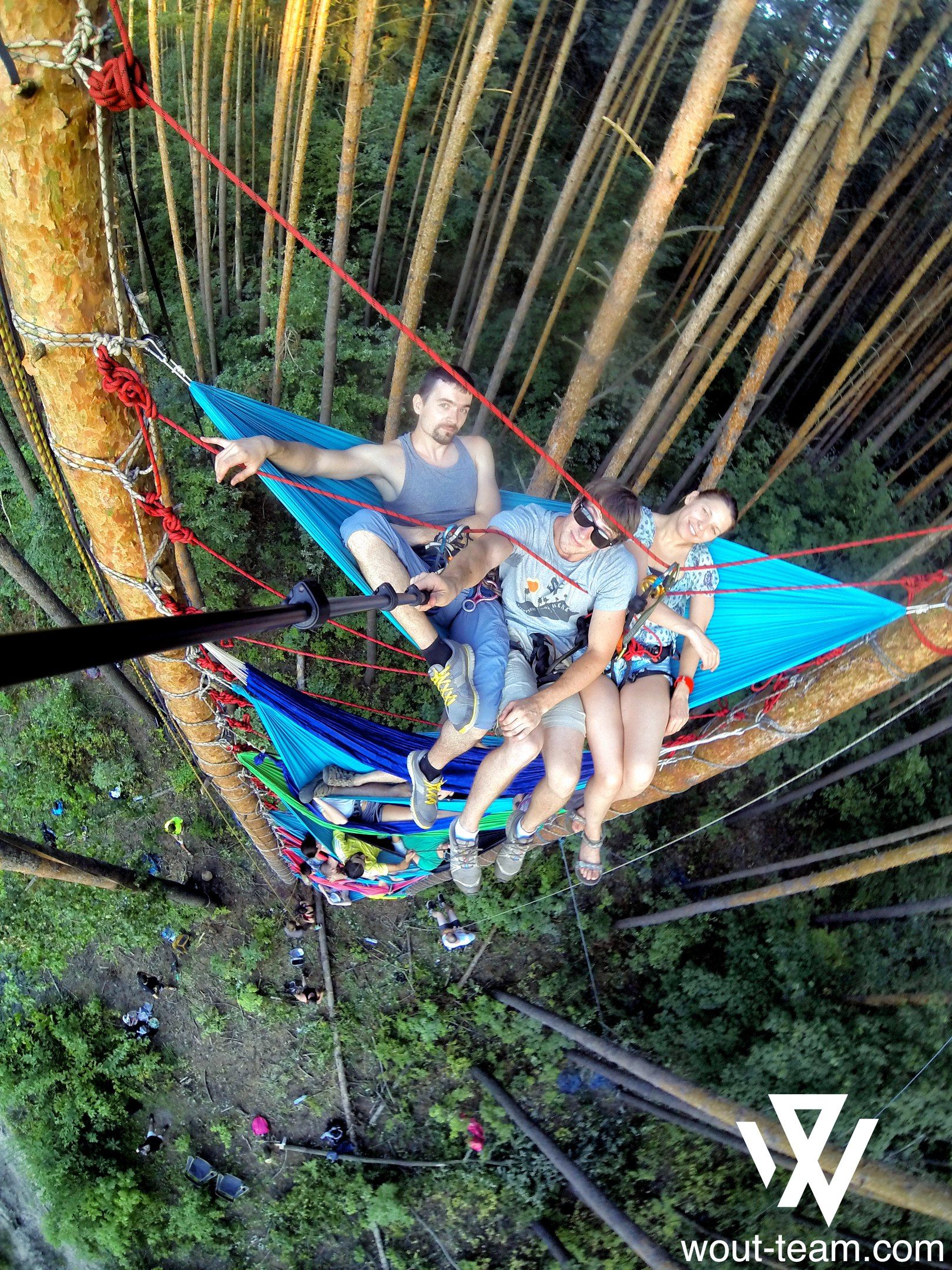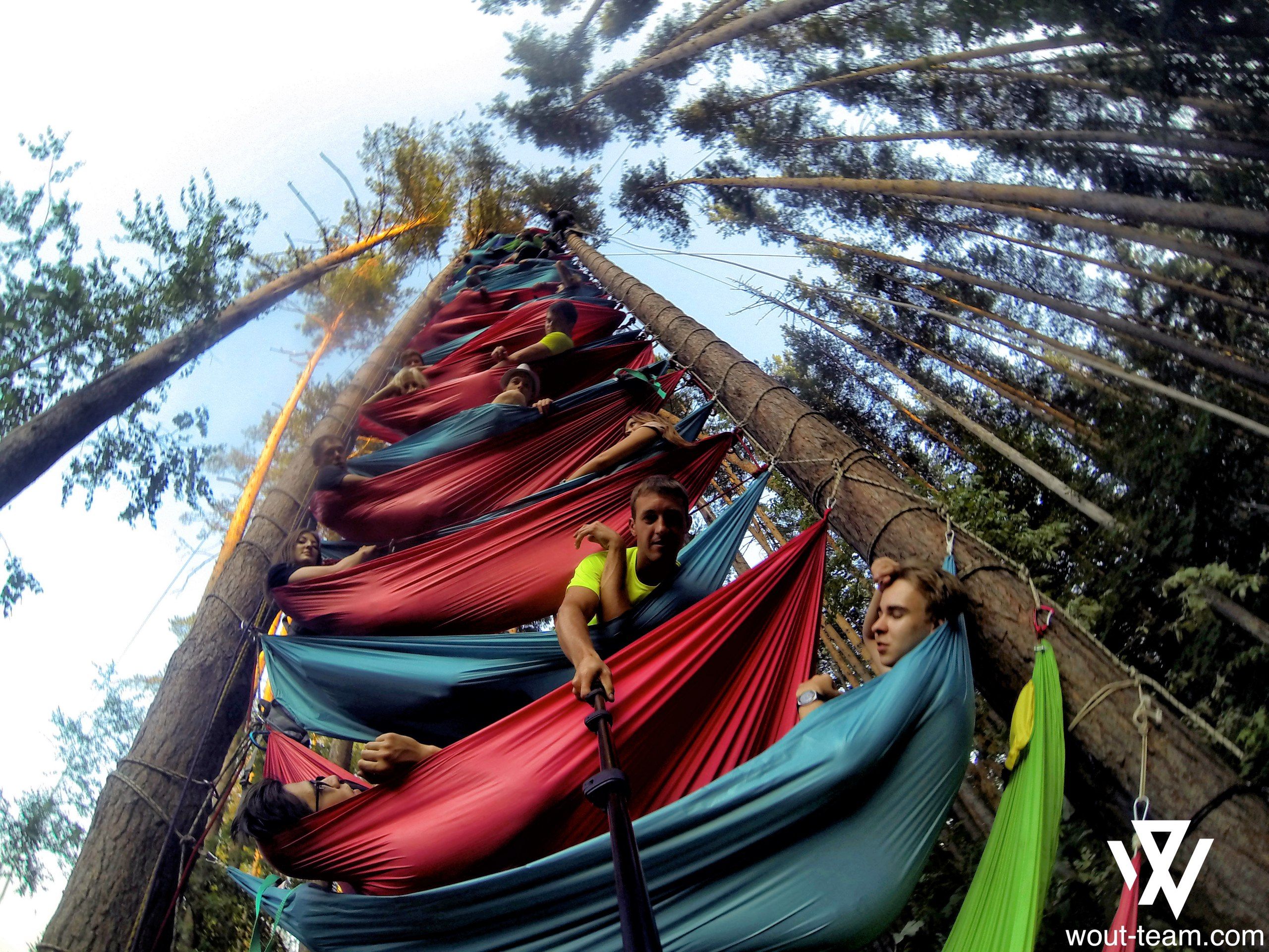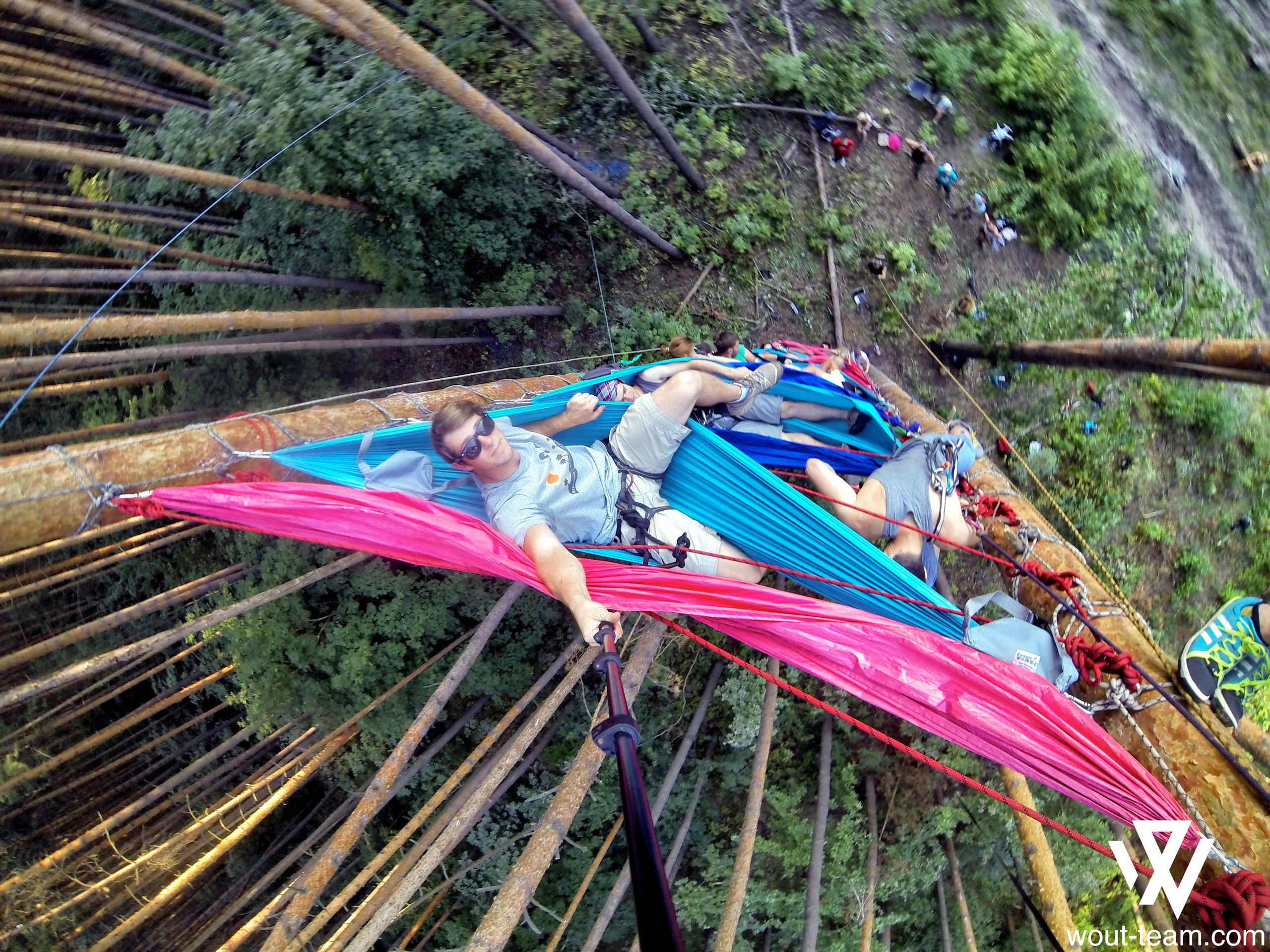 Группа воронежских экстремалов Wout натянула между двух деревьев сразу 31 гамак — один над другим. Чтобы соорудить такую конструкцию, понадобилось 32 человека, километр веревки и 12 часов.