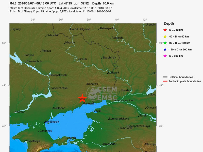 Как сообщается на официальном сайте EMSC, эпицентр землетрясения находился на глубине 10 км в 78 км к югу от Донецка и в 21 км к северу от поселка Старый Крым - недалеко от Мариуполя.