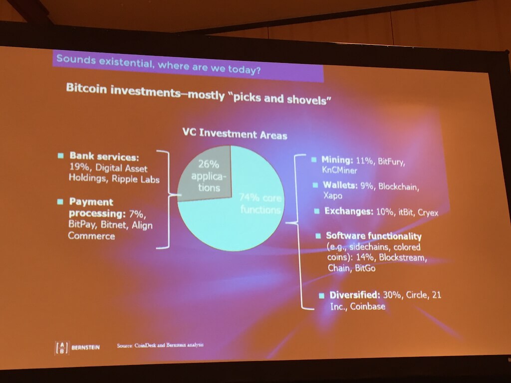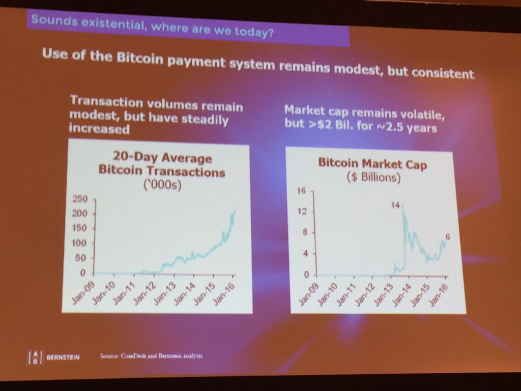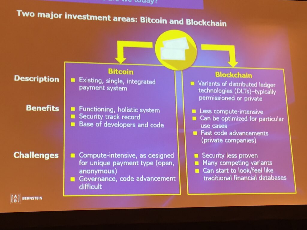14 марта 2016 года Лиза Эллис (Lisa Ellis) и Винсент Спизири (Vincent Spiziri), специалисты инвестиционного фонда Бернстайн (портфель управляемых фондом активов оценивается в 474 миллиарда долларов), представили посетителям SXSW 2016 взгляд крупных инвесторов на нарождающиеся технологии цепочки блоков (blockchain) и самой популярной ее производной – криптовалюты Bitcoin. Эти технологии, считают докладчики, уже сейчас совершают революцию в банковском деле за счет безопасности, эффективности, прозрачности децентрализованных транзакций.