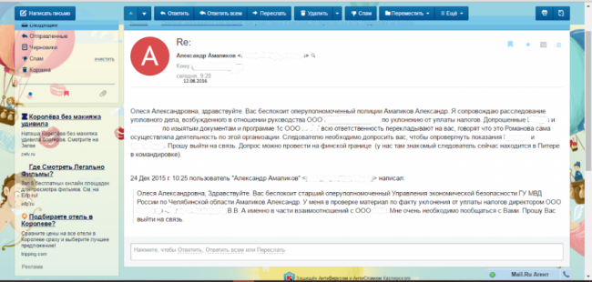 В сообщении, полученном Романовой от оперуполномоченного полиции Александра Амаликова говорится, что ее необходимо допросить для того, чтобы опровергнуть данные против Романовой показания. Амаликов предлагает Романовой осуществить допрос на российско-финской границе «знакомым следователем», находящимся в Петербурге в командировке.
