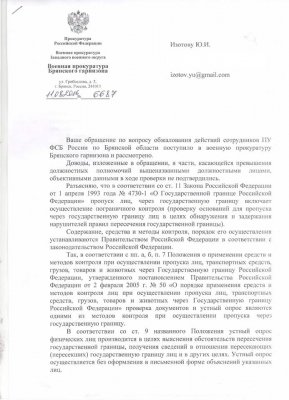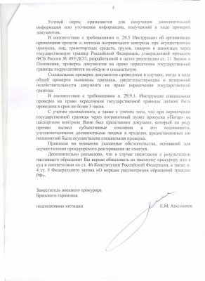 В документе военной прокуратуры говорится, что «проверка документов и устный опрос являются одними из методов контроля при осуществлении пропуска через государственную границу» и что «устный опрос физических лиц производится в целях выяснения обстоятельств пересечения государственной границы, получения сведений в отношении пересекающих (пересекших) лиц и в других целях».