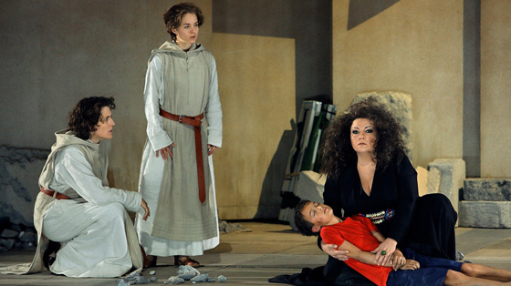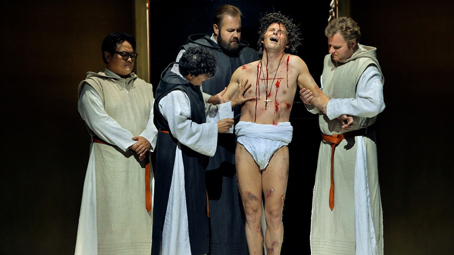 © Bayreuther Festspiele / Enrico Nawrath Рыцари Грааля предстали монашеским орденом в соответствующих облачениях. Парсифаль проделывал карьеру от деревенского новобранца до опытного солдата-наемника (кажется, в рядах «голубых касок»). Клингзор оказался извращенцем-фетишистом, Кундри — рабыней в его публичном доме, Амфортас — одним из ее старых клиентов. В сцене причастия послушник-паж вскрывал рану беспомощного вожака ножом, бутафорская кровь натуралистически стекала в чашу Грааля, которая шла по кругу среди солистов. Рядовые хористы тем временем наполняли свои чарки кровью из небольшого краника, что практично, но немного смешно. В зарезервированном для прессы 25-м ряду азартно скрипели карандаши и кто-то острил, что усиленные отряды полиции предназначены не столько для того, чтобы никто не вбежал в театр, сколько для того, чтобы никто не выбежал.