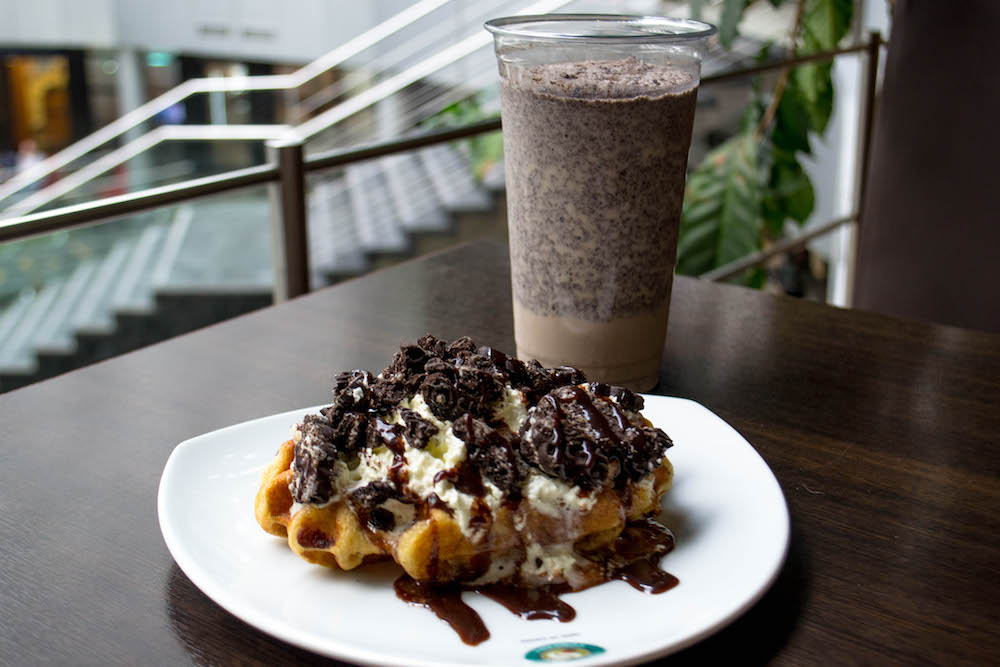 Вафля: венская вафля, взбитые сливки, печенье «Орео», шоколад. Орео-шейк: молоко, лед, печенье «Орео», фраппе, белый шоколад.