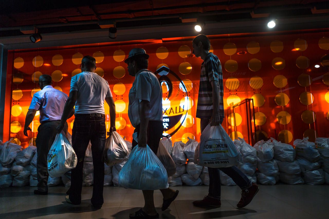 Many people rely on humanitarian supplies. One of the primary suppliers is Rinat Akhmetov himself. Throughout the conflict, almost 9 million "survival kits" have been distributed in the region. "I used to be ashamed to wait in line for these," says Andrei Vitalyevich. "I am an associate professor, after all—once a man of certain influence. But you get used to anything."