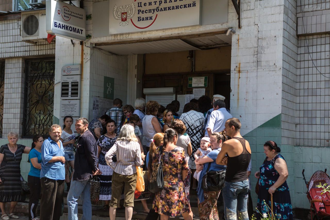 Most people don't have cards yet. At midday, a Central Bank office in Petrovsky district is besieged by a line that stretches outdoors at a considerable distance. Fifty people try to hide from the sun in the shadows cast by three trees and a canopy at the entrance. Most likely they will have to wait throughout the afternoon. Fiddling with a baby stroller, a woman named Svetlana explains that she's here for the children's allowance, which is 2,000 rubles ($30). "What can I buy with this? My mom is now waiting in line for humanitarian supplies, and we also have a vegetable garden. That'll keep us alive."