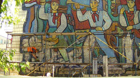 Поскольку письма чиновникам не работают, в Киеве мы возле некоторых мозаик установили «музейные» таблички с описанием: что это за мозаика, кто автор, год создания. Потому что даже осознание того, что перед тобою не просто кусок цветной стены, а произведение искусства, создает ментальный барьер перед тем, чтобы повесить туда кондиционер, как раньше бывало, или сбить, закрасить, если там изображены серп и молот. Добавив к мозаикам специфические музейные атрибуты, название, экспликацию, мы объективировали их как произведения искусства, и, может, поэтому они до сих пор живы. За 25 лет независимости большинство произведений советского периода утратило свое идеологическое содержание, которое как раз и актуализировала декоммунизация. Что тоже парадоксально само по себе.
