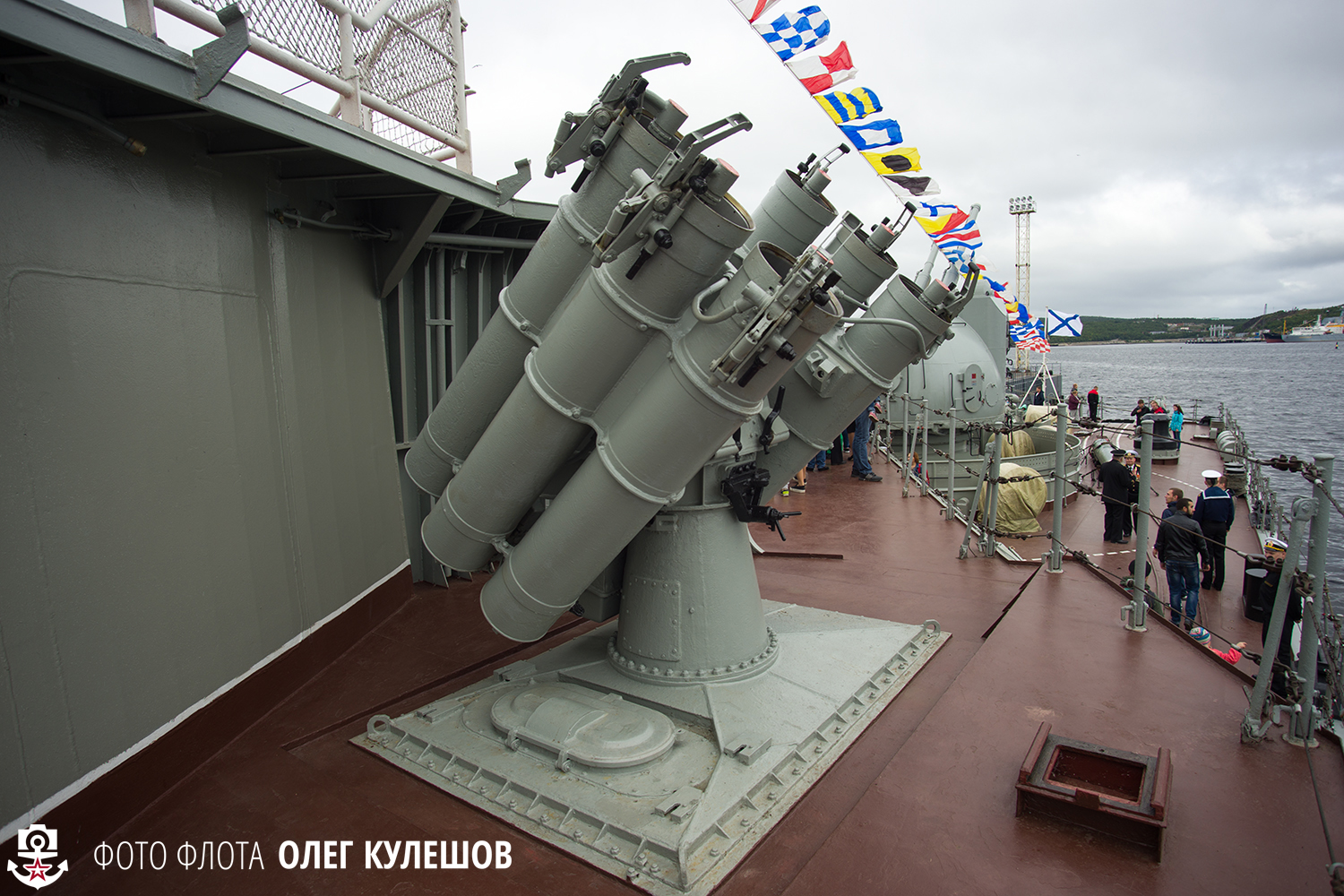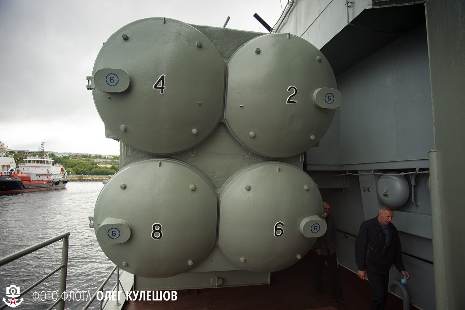 РБУ-1000 - реактивная бомбометная установка - 1000. Реактивный бомбомет с боезапасом 48 реактивных глубинных бомб. Дальность поражения до одного километра. Основная задача – обеспечение противоторопедной защиты корабля. Стрельба производится полным залпом.