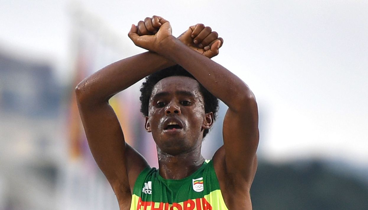 Фейис Лилеса поддержал протест против правительства Эфиопии. Скрещенные над головой руки — не просто жест. Лилеса выразил солидарность с людьми, которые последние несколько месяцев протестуют против эфиопских властей.