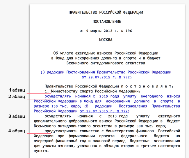 «Абзац второй пункта 1 постановления Правительства Российской Федерации от 9 марта 2013 г. № 196 „Об уплате ежегодных взносов Российской Федерации в Фонд для искоренения допинга в спорте и в бюджет Всемирного антидопингового агентства“ изложить в следующей редакции: „осуществлять в 2015 году и начиная с 2017 года уплату ежегодного взноса Российской Федерации в Фонд для искоренения допинга в спорте в размере 150 тысяч евро“»