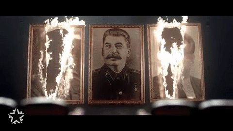 At the end of the music video, portraits of Saddam Hussein and Kim Il Sung are torched with flamethrowers, but Stalin's photo is left hanging. Just as two women raise a hammer and sickle (the symbols of Soviet Communism), a bright light appears over shoulder, and they turn from Stalin and face the horizon, sparing the mustachioed tyrant.