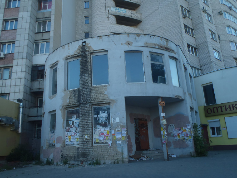 Витрины вдоль Московского проспекта в этой части не примечательны, стилобат первого этажа (цоколь первого этажа) не эталон привлекательности. Наиболее выразителен в нашем случае угол улицы Димитрова возле бани №9, напротив рынка Придача. Данный угол больше напоминает руины Колизея, чем центральную улицу Левобережного района. Стимулов зайти в магазин мало, магазины в данном районе рассчитаны на удовлетворение самых простых потребностей, на товары ежедневного спроса.