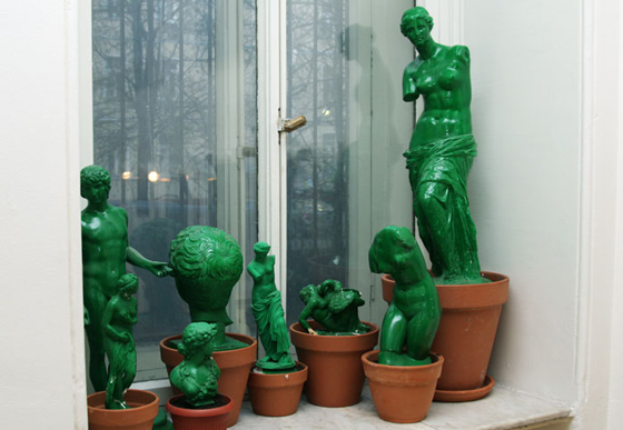 © Валерий Леденев Александр Повзнер. Выставка «Настоящее совершенное». Зал «Армянский, 13». 2009 Пока Александр был студентом ИПСИ, он временно перестал лепить: «Я начал учиться, узнавать много информации, которая меня перевернула с ног на голову. И то, что называется “скульптура”, отделилось в виде большого странного органа, инструмента. И я его отложил. При этом я начал больше работать головой, создавать некоторые объекты, которые все равно находились в пространстве». Художник сменил материал, занимался видео и фотографией, перестал обращаться к своим старым работам. Но потом постепенно вернулся к скульптуре, которая все равно была ему наиболее приятна и удобна. Александр, обладая навыками классической скульптуры, работает именно с ней, но как современный художник — со своим собственным пониманием. В его мастерской можно увидеть почти сказочные вещи: знакомый всем бюст Сократа, но с моржовыми клыками или узнаваемые женские изгибы Афродиты, дополненные большим хвостом русалки.