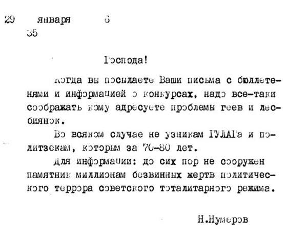 Гулаговские реалии окончательно заместили в интеллектуальной памяти интеллигенции плюралистичный раннесоветский гендерный опыт; они также столкнули советское общество с неизвестной и не видимой до этого момента в таких масштабах практикой насильственного однополого секса. Дореволюционная концепция дегенерации (одна из многих конкурирующих теорий), ставящая гомосексуалов в ряд «неполноценных» вместе с проститутками и душевнобольными, отражала исключительно экспертный взгляд и на формирование общественных представлений о гомосексуальности влияния не оказала. Модерная гомофобия возникла позже. Все существующие лагерные мемуары и воспоминания, в которых можно найти упоминания об однополой любви, полны макабрических эпитетов и отвращения. И Варлам Шаламов, и Евгения Гинзбург строят свой нарратив об «омерзительных существах» с помощью одних и тех же приемов, проанализированных в работе Ади Кунцман [9]. В «отвращении» к гомосексуалам она видит не только литературный прием, подчеркивающий положение ада, инферно, перевернутого мира, в который они попали, но и специфический путь для выживания с помощью поддержания собственных символических, культурно и классово обусловленных границ. Документ, представленный ниже, был обнаружен в одном из московских архивов. Это письмо Николай Нумеров, президент Российской ассоциации жертв политических репрессий, отправил инициативной группе ЛГБТ в 1990-е в ответ на приглашение к участию в мероприятии. Из-за ограничения доступа к архивным делам, содержащим «персональные данные», на 75 лет для всех, кроме родственников, то есть для подавляющего большинства профессиональных историков, советские гомосексуальные мужчины и женщины остаются невидимыми, не существующими ни для тех, кто занимается жертвами политических репрессий, ни для родственников (в случае, если они остались), для которых осуждение не по политической 58-й, а по 121-й («мужеложество») статье просто не мыслится как повод для запуска процесса реабилитации.