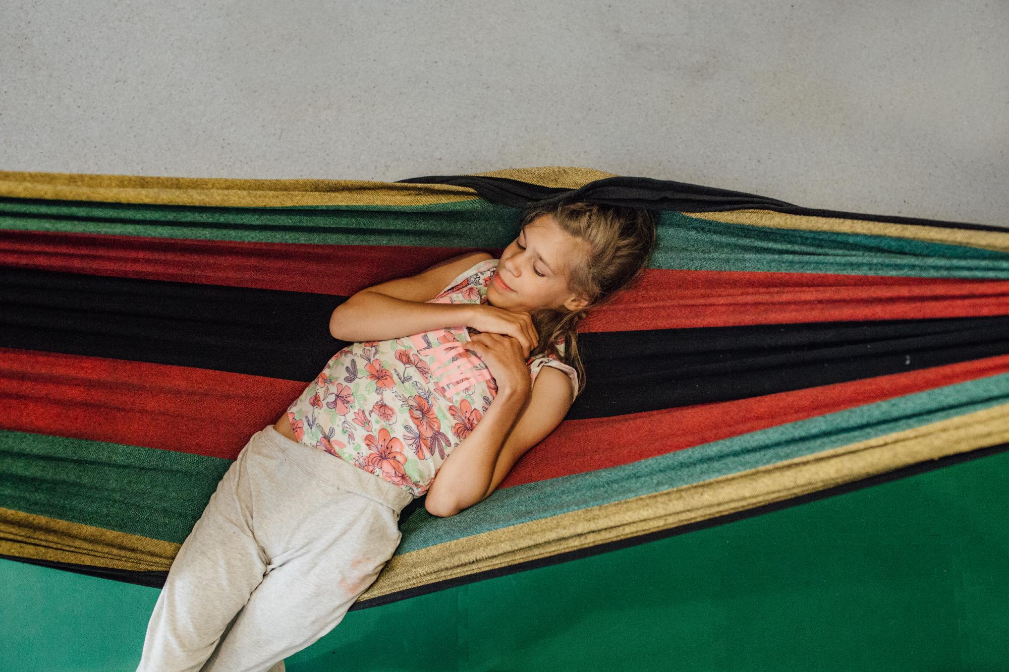На мате в углу большой комнаты с гамаком и диваном лежат две веселые девчонки и звонко хохочут. Доктора изображает юная Катя в рваных джинсах, кобру — Инна, двенадцатилетняя девочка с ограниченными возможностями.