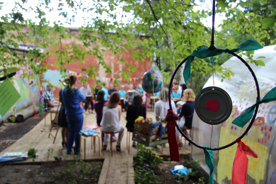 Этот уголок за три летних месяца стал неузнаваемым. Из серого, никому не нужного, поросшего бурьяном куска земли, он стал именно таким, чтобы без преувеличения именоваться садом. Здесь пока не цветут груши или яблони, зато в середине установлена настоящая сцена, рядом — огромная теплица, по краям высажены цветы, стены пестрят яркими рисунками, а под ногами уже не сухие листья с травой и непроходимые кусты, а чистая полянка с зеленой травой. Все это сделали своими руками родители детей-аутистов, которые занимаются в творческой студии Натальи Никулиной.
