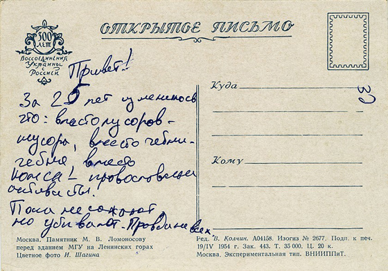Евгений Фикс: Да, действительно, «Открытки с революционной плешки» — это реальные советские открытки, напечатанные в государственных издательствах и прошедшие цензуру, — с видами Большого театра, памятника Юрию Долгорукому, Центрального музея Ленина. Но одновременно эти места — еще и советские «плешки». Так уж получилось: исторически эти государственные или культурные достопримечательности города были апроприированы как места однополого желания — потому что они в центре города, близко к метро, вокруг много людей и легко затеряться в толпе.