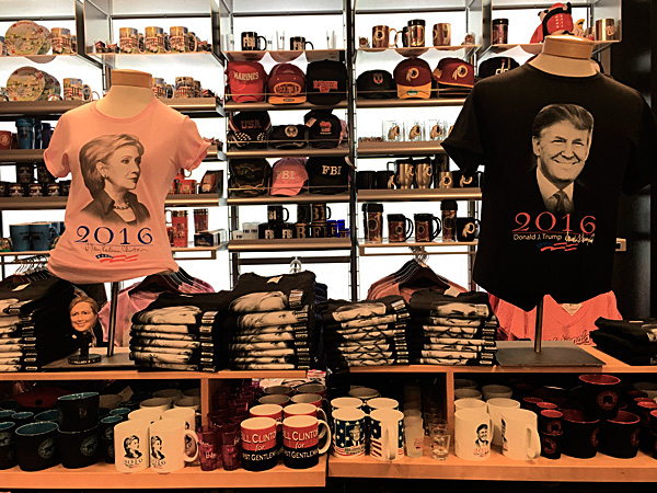 Магазин с символикой выборов США Комментаторы в американских СМИ анализируют складывающуюся ситуацию противостояния между кандидатами в президенты США Хиллари Клинтон (от демократов) и Дональдом Трампом (от республиканцев).