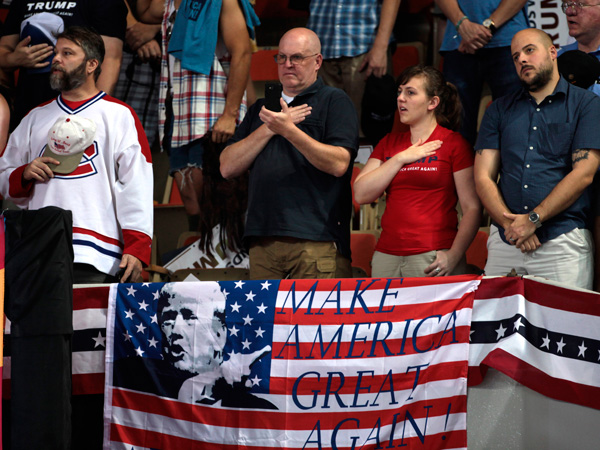 Сторонники Д.Трампа / wikipedia.org NY Times пишет, что в последних опросах общественного мнения Трамп предстает преимущественно в образе мракобеса. По одному из опросов, такого мнения о нем придерживаются 59% респондентов (при этом 29% составляют те, кто обычно голосует за республиканцев). В числе этих 59% представлены люди самых разных политических взглядов, возрастов и рас. Но главная угроза авторитету Трампа, подчеркивает автор, исходит от белых избирателем с высшим образованием.