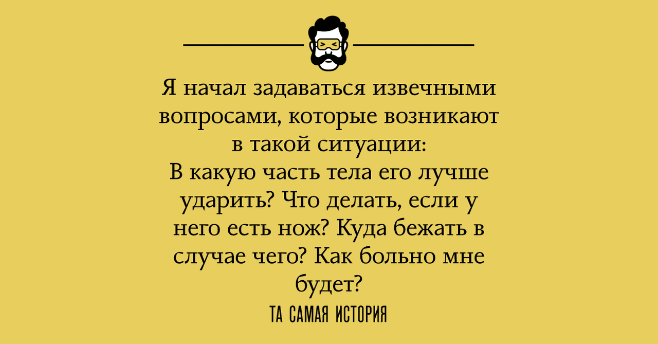 Я начал задаваться извечными вопросами, которые возникают в такой ситуации: в какую часть тела его лучше ударить; что делать, если у него есть нож; куда бежать в случае чего; как больно мне будет и прочими, как вдруг раздался второй голос: