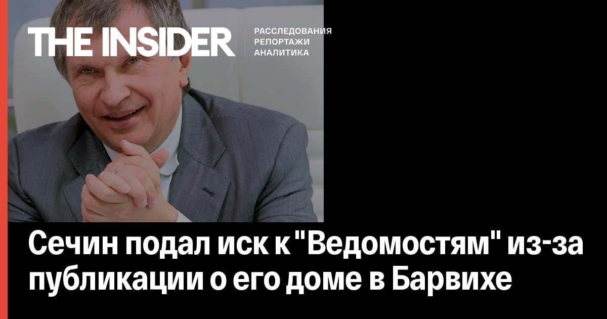 Глава «Роснефти» Игорь Сечин подал иск против издательского дома «Бизнес Ньюс Медиа», управляющего газетой «Ведомости», и журналиста издания Рината Сагдиева. Как сообщает RNS со ссылкой на сайт Останкинского суда Москвы, претензии касаются публикации расследования о коттедже Сечина в поселке Барвиха.