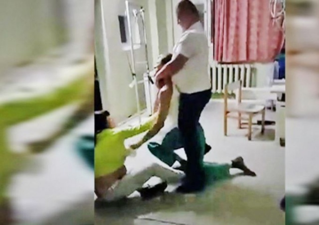 Очевидцы сняли на видео, как разъяренный мужчина наносит несколько ударов кулаком по лицу упавшему на пол рентгенологу.