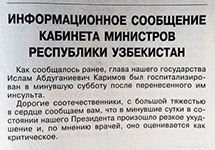 Узбекские СМИ опубликовали сообщение кабинета министров о состоянии президента страны Ислама Каримова, в котором отмечается, что состояние узбекского лидера за последние сутки резко ухудшилось. Как пишет Gazeta.Uz, сообщение кабмина на русском и узбекском языках напечатали газеты "Правда Востока", "Народное слово" и "Халк сузи".