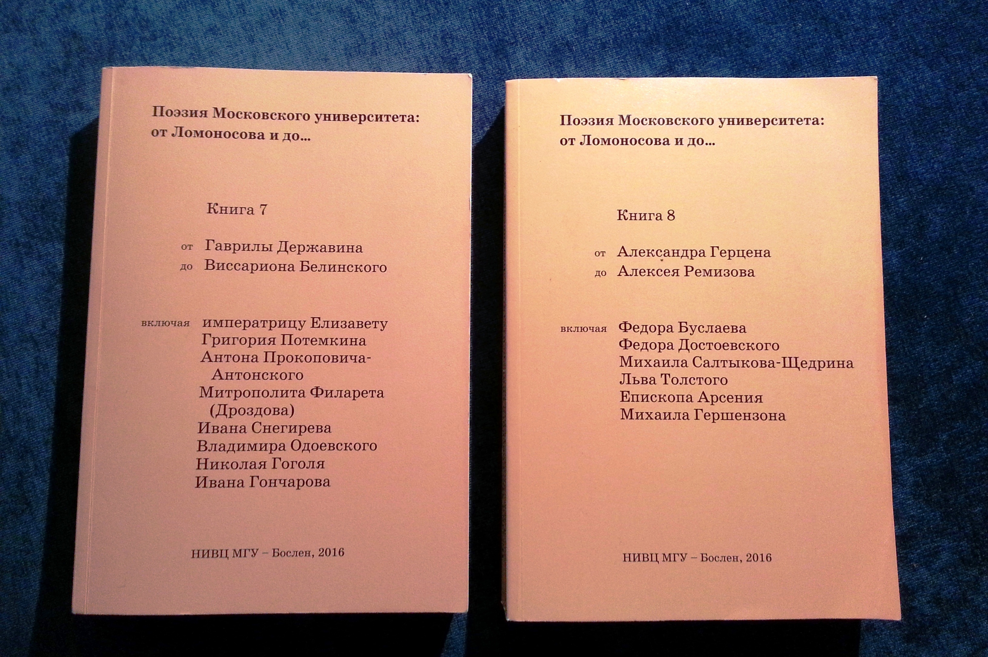 Лиля Пальвелева: Книжная серия "Поэзия Московского университета от Ломоносова и до…." – это большой, многолетний проект. Сейчас стараниями двух издательств – НИВЦ МГУ и "Бослен" – одновременно вышли в свет два очередных тома. На обложке 7-го тома перечень имен заканчивается Николаем Гончаровым, а 8-го - Михаилом Гершензоном. Соответственно, это литераторы, родившиеся в 18 или в начале 19 века, а в следующей книжке – во второй половине позапрошлого столетия.