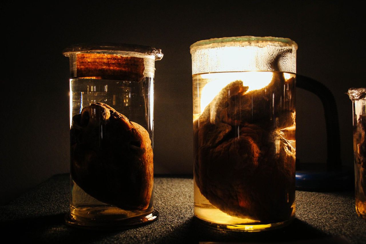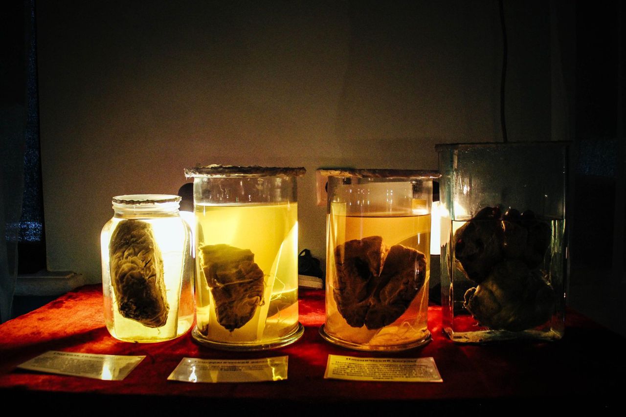 Рак пищевода, рак гортани, гастрит, болезни кожи лица — я продолжаю экскурс во внутренний мир человека. Уже освоившись, я оставила без внимания стенд с аппендицитом и мозжечком, тумбу с инсультами и девятимесячного ребенка «времён Николая II». На очередном стенде в формалине плавают матки, тут есть внутритрубная беременность, доброкачественная опухоль, которая задушила ребёнка (ребёнок здесь же, видны маленькие пяточки), здоровая же матка, которая находится тут для сравнения, почему-то содержится в банке с российским гербом на крышке.