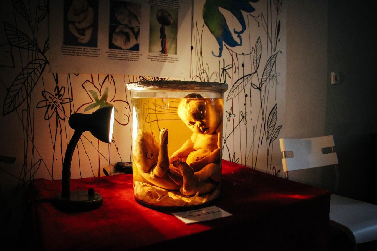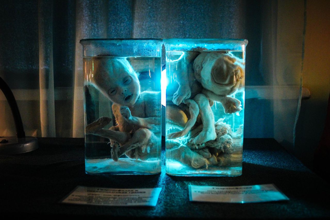 Мы проходим в угол комнаты, там в большом вертикальном цилиндре плавает Янус, у него действительно два лица, светло-зелёная кожа, и, если верить табличке, «волчья пасть» — отсутствует перегородка между носом и нёбом. Алексей тычет в колбу указкой: «У него три глаза, два рта, два носа, плюс анэнцефалия, то есть отсутствует мозг. При кровосмешении рождаются вот такие дети, либо дети с более сложными патологиями, поэтому браки между близкими родственниками даже в наше время запрещены практически во всём мире».