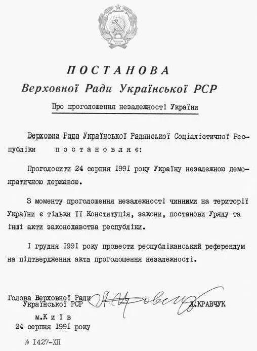 Верховный Совет Украинской ССР принял Акт о провозглашении независимости Украины, в котором торжественно провозгласил создание самостоятельного украинского государства – Украины.
