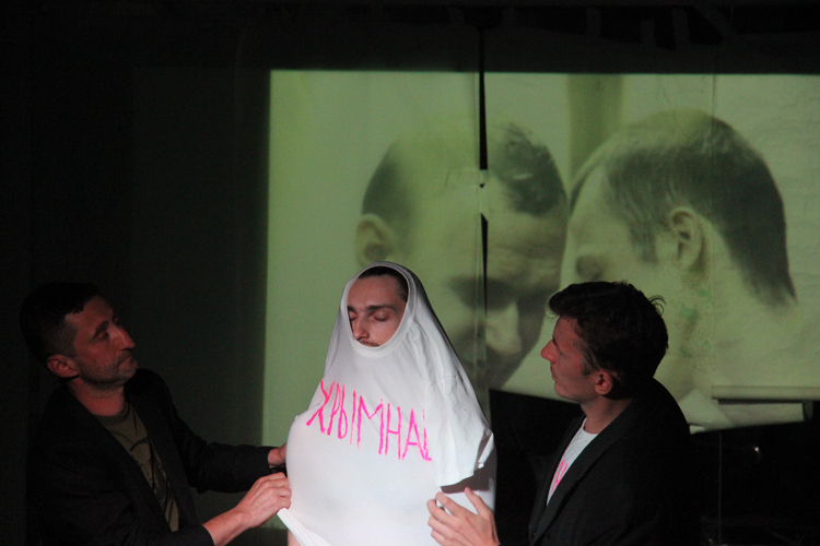 Предприниматель из Луганска Дмитрий Бел прилежно фиксирует в дневнике быт и психологию войны: вот так пришло осознание, что в городе можно погибнуть, вот так изменились отношения с другом из спокойного региона, вот так ведут себя ополченцы, вот так — обычные горожане. Пьеса Марка Равенхилла описывает гипотетическую судьбу одной военной фотографии, демонстрируя роль медиа в современных конфликтах: очевидно, что ребенок на фото убит химическим оружием — но истина в сегодняшней медиареальности не так важна, куда важнее, чья интерпретация действительности окажется красноречивее. Текст Греминой о проукраинских активистах из Крыма и направленной против них спецоперации ФСБ начинается с обескураживающей реплики в зал: «Ну-ка, поднимите руки, кто считает, что у него есть яйца». В сущности, это история о том, как одних людей удается сломать, а других — нет. В спектакле на сломавшихся героев натягивают футболку с бодрым розовым принтом «Крым наш»: когда один из них отказывается от показаний, выбитых под пытками, то немедленно сбрасывает с себя этот аналог смирительной рубашки.