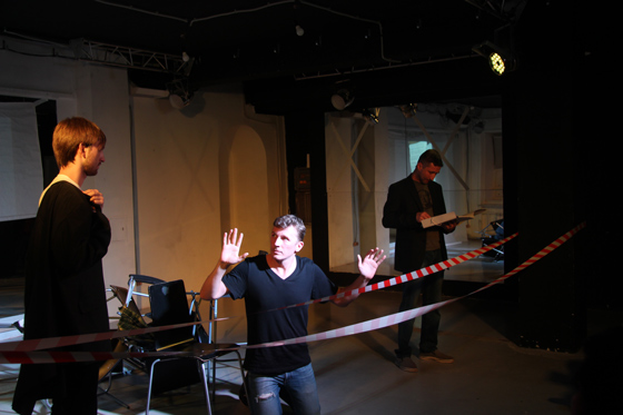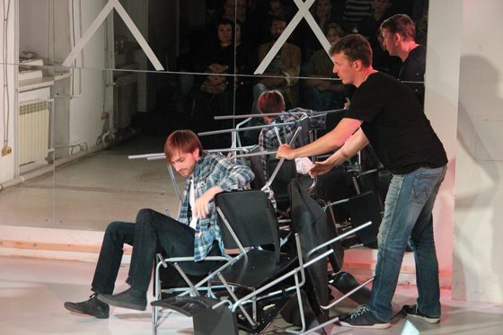 © Нестор Ротсен Задача Переля в течение первой части — мешать: пока товарищи говорят со зрителями, он делает собственную загадочную работу — и делает ее невозмутимо, по-хозяйски. На робкие просьбы актеров вести себя тише огрызается. Заклеивает зеркала скотчем крест-накрест, как окна при бомбежке. Опрокидывает стул, второй, третий; последний без малейшей борьбы выдергивает из-под Мулакова. Военные ассоциации продолжаются: два перевернутых и сцепленных стула похожи на противотанковый еж, куча стульев — на баррикаду. В заключение картины между залом и сценой натянут полосатую сигнальную ленту — художник-постановщик Евгения Кауфман, естественно, говорит о крахе нормальной жизни, а герой Переля персонифицирует большую политику, которая чихать хотела на частного человека.