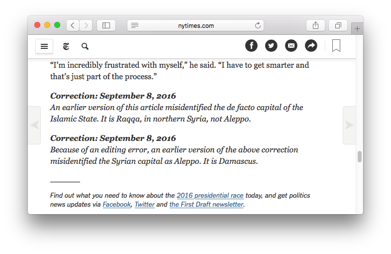 Беда в том, что Алеппо — не столица Сирии. Поэтому NYT пришлось написать еще одно исправление: «Из-за ошибки при редактировании предыдущая версия исправления выше неправильно указывала Алеппо столицей Сирии. На самом деле, [столица Сирии] это Дамаск».