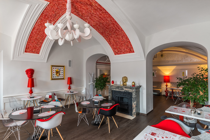 Кафе было открыто как проекция эпохи Фаберже — «торжества русского стиля». Здесь сохранены элементы интерьера: сводчатые потолки, античные фрески и орнаментальная живопись, которые соседствуют с работами современных художников. Акцент меню сделан на десертах: угощают фирменным кофе и печеньем, эклерами, а по особым дням готовят любимые блюда Карла Фаберже, который ценил прибалтийскую и русскую кухни.