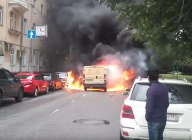 Скрываясь, преступники подожгли инкассаторский бронированный микроавтобус, после чего огонь перекинулся на легковой автомобиль.