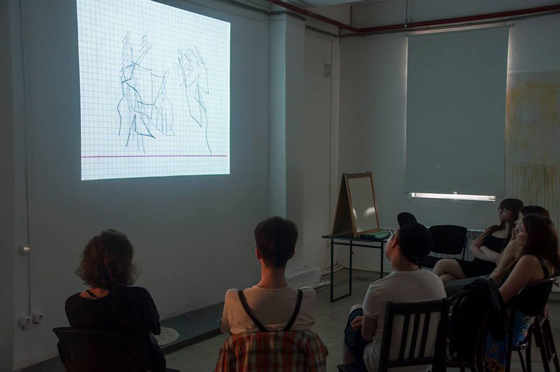 © Елена Седова Мастер-класс Яна Тамковича «Сеанс автоматического рисунка. Медиум Гинзбурга» на выставке «В сети формы» в Центре «Красный». 2016