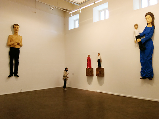 Когда поднимаешься по парадной лестнице на выставку, первые, кто встречает зрителя, — две скульптуры (бронзовые, а не деревянные, как практически все у Балкенхола), изображающие согнутых людей. Одна смотрит куда-то наверх, другая — более-менее на входящих. Как минимум половина представленных работ художника обращена на зрителя. По-фирменному грубые фигуры буквально глазеют на тех, кто смотрит на них.