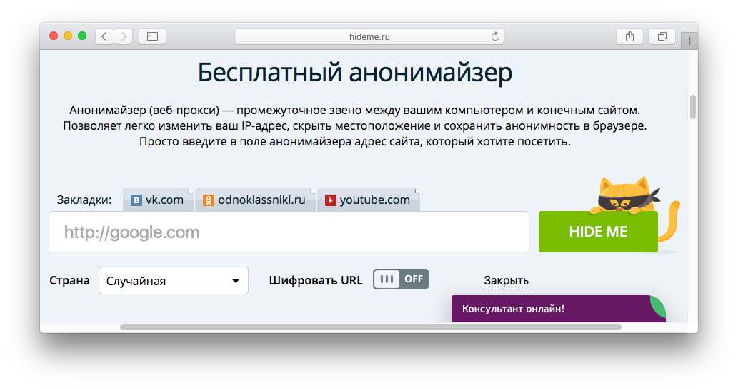 Анонимайзеры, например Hideme.ru, «Хамелеон» или Hideme.in, — это сервисы, которые должны скрыть ваши данные от владельцев сайта. Но они же помогают обходить блокировки, потому что «переносят» пользователя в другую страну.