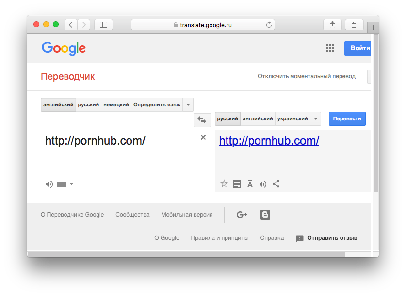 Еще один способ использовать сервисы Google не по назначению. Google Translate умеет переводить целые страницы — достаточно ввести в левое поле соответствующий адрес и кликнуть по ссылке, которая появится справа.