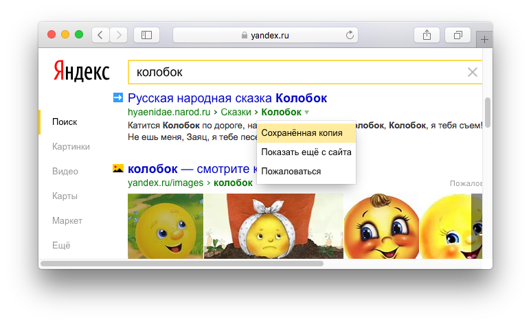 Кэш страницы можно поискать и в «Яндексе», но делать это менее удобно: нужно добиться, чтобы ваша страница появилась в выдаче, затем нажать на стрелочку в зеленой строке и выбрать пункт «Сохраненная копия».