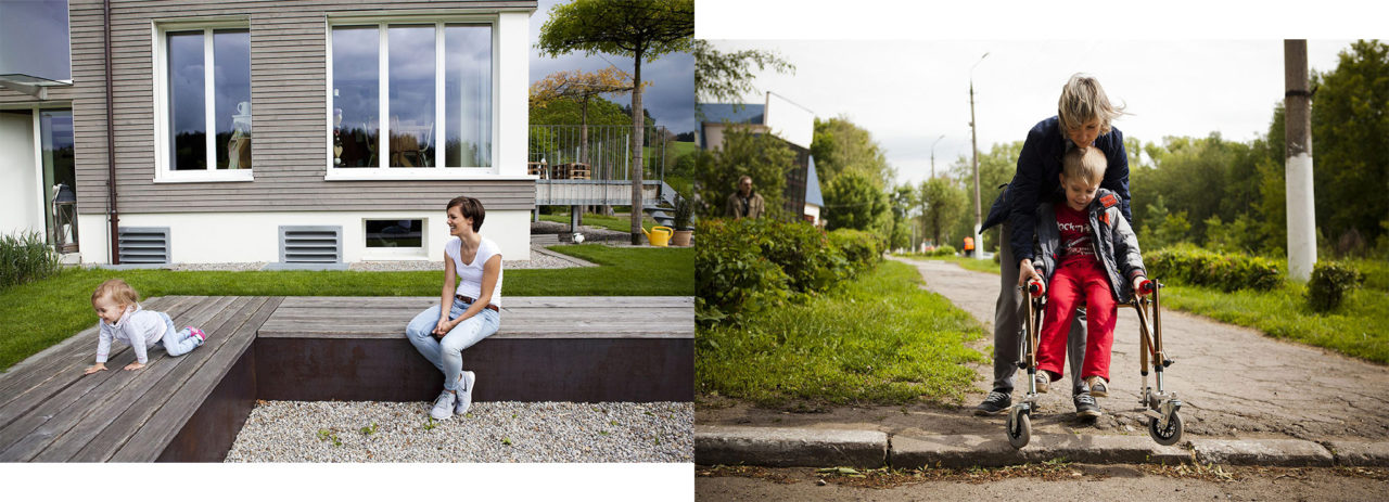 Слева: Амели ползает по деревянному настилу около домаСправа: Костя с мамой живут в недоступной средеФото: Ольга Павлова
