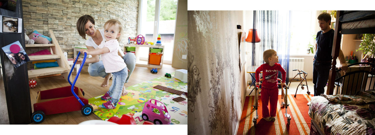 Слева: Мама учит Амели передвигаться с помощью игрушечной тачкиСправа: Папа смотрит, как Костя осваивает ходункиФото: Ольга Павлова
