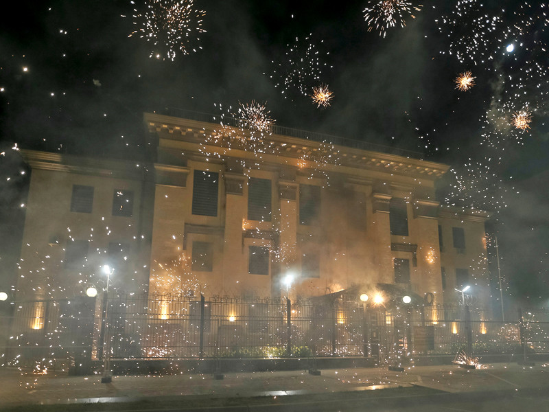 Дипломаты сообщают, что на территорию посольства кинули дымовую шашку, а здание обстреляли при помощи салютной установки. "Выстрелы были направлены непосредственно на здание дипмиссии. По счастливой случайности возгорания не произошло" - сообщили в представительстве России.