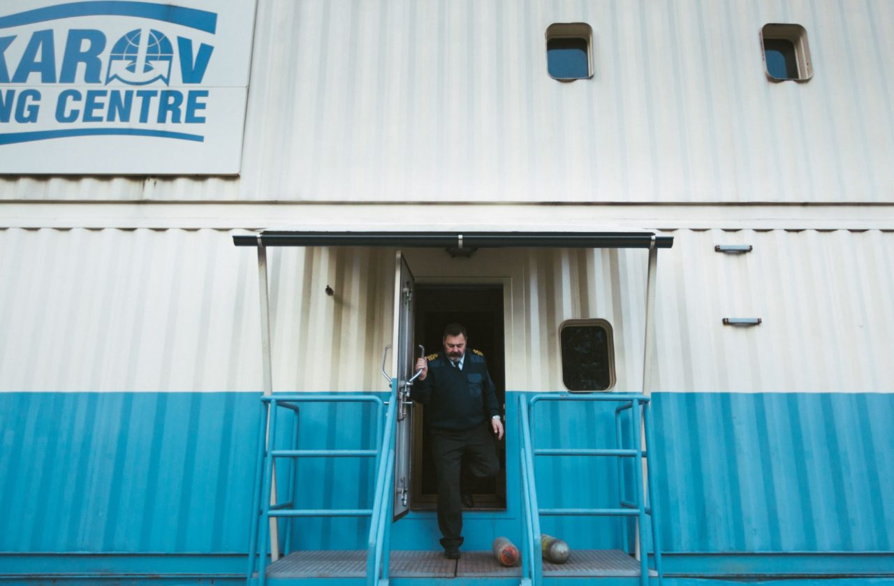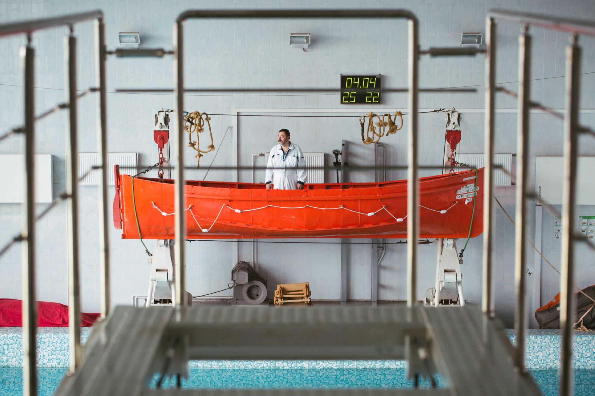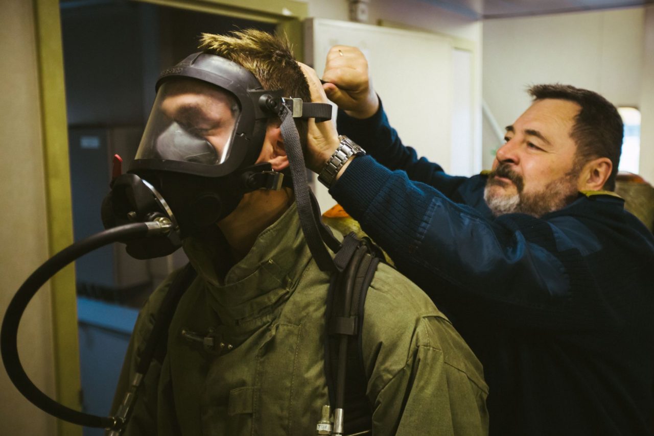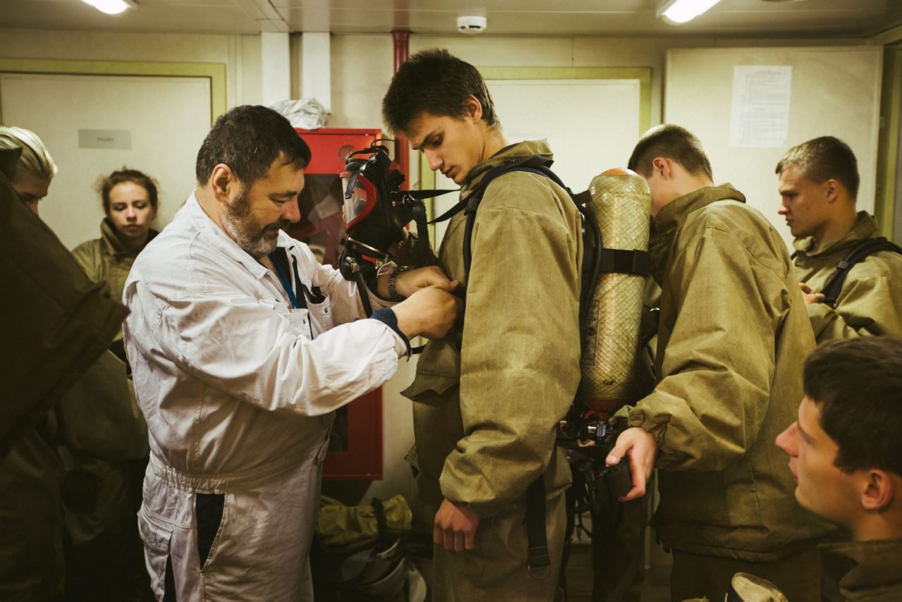 Мы в тренажерном центре — это собранный из контейнеров трюм корабля на территории морского колледжа. И одиннадцатый по счету корабль Сергея Михайловича. На нем Сергей Михайлович инструктирует группу курсантов — десять человек в защитных костюмах и касках по очереди проверяют герметичность масок, клапаны на баллонах и давление в манометрах.
