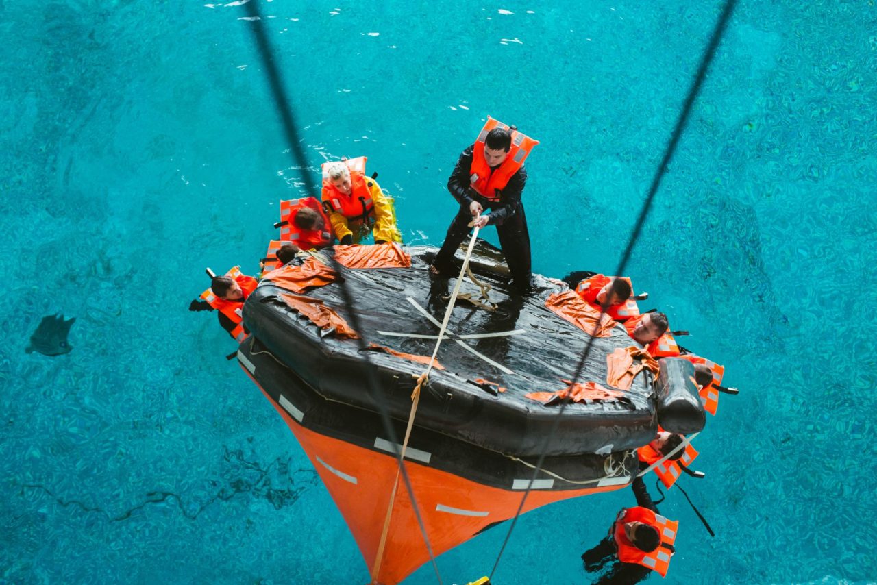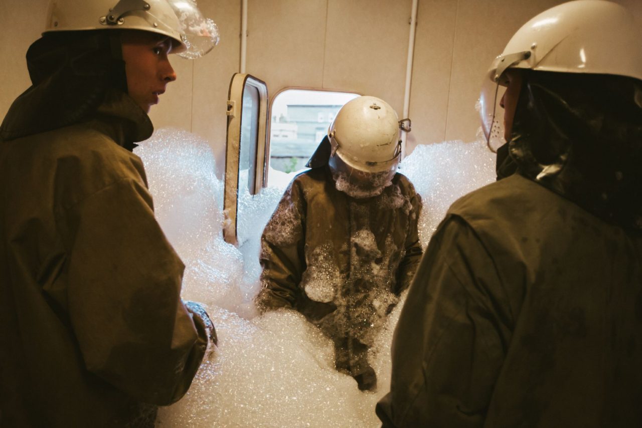 Сергей Михайлович рассказывает, что делать, если на судне возник пожар. После инструктажа группа получает задание: пройти лабиринт в дыму и через крышку люка спуститься в трюм.