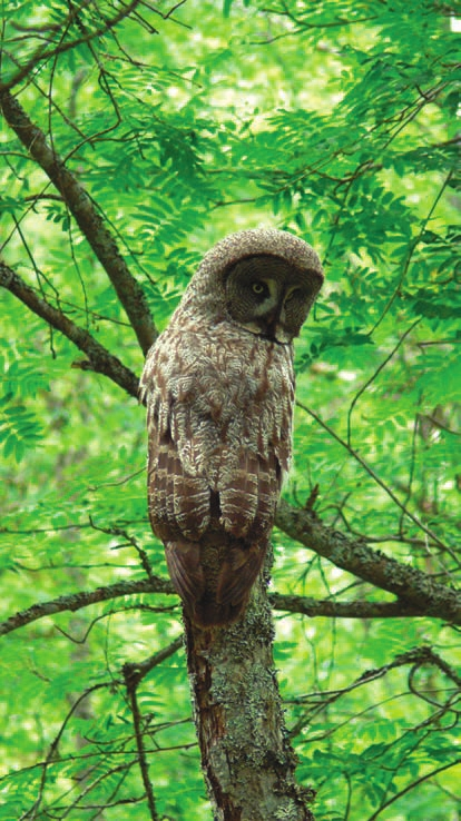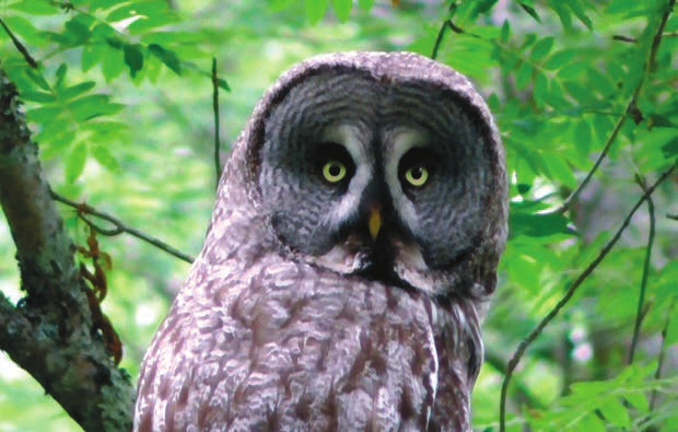 Всегда досадно увидеть редкую птицу только единожды, и то мельком. Мне пришлось ждать два года, прежде чем удалось рассмотреть бородатую неясыть поближе. В июле 2016 года я участвовал в проведении экологической смены в детском лагере на территории Кенозерского национального парка, недалеко от Каргополя, вел там экскурсии, показывая школьникам птиц и следы зверей. 16 июля вместе с группой участников лагеря, с вожатыми и педагогами мы вышли из деревни Масельга к Порженскому погосту — памятнику архитектуры XVIII века, недавно отреставрированному. Путь был неблизкий, более 15 км по лесной дороге, и мы остановились отдохнуть на полпути у заброшенной деревни Думино. Пока готовился обед, мы со школьниками прошлись по деревне и по ее ближайшим окрестностям. Была середина дня, жара, и птиц удалось увидеть немного. На обратном пути я отпустил детей с вожатым на обед и свернул в заболоченный березняк, откуда доносились хриплые крики, заинтересовавшие меня. Я не мог понять, какая птица их издавала. Вдвоем с директором лагеря, Татьяной Козинской, мы не прошли и сотни метров от дороги, как увидели сидевшую на высоком сухом пне взрослую бородатую неясыть. Огромная сова сидела молча и, казалось, не уделяла нам должного внимания. Бегло посмотрев на нас, она начала что-то разглядывать в стороне, и мне приходилось издавать губами тонкий писк, напоминающий писк мыши, чтобы сова снова повернулась к нам, позволив себя сфотографировать. В юности, подманивая так серую неясыть, я чуть было не лишился глаза, когда сова вылетела ко мне в густых сумерках, уже выпустила когти и еле успела затормозить и отвернуть от самого моего лица. Но при свете дня такое манипулирование совой казалось безопасным. Действительно, огромная птица и не подумала слететь с удобного насеста. Сова подпустила нас близко, сидела долго, но потом, наконец, взъерошила перья, выпустила в нашу сторону струю помета и перелетела метров на тридцать.