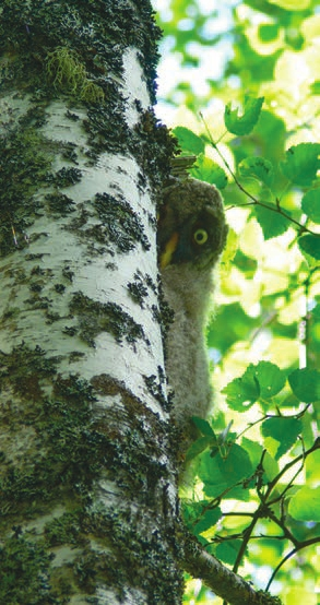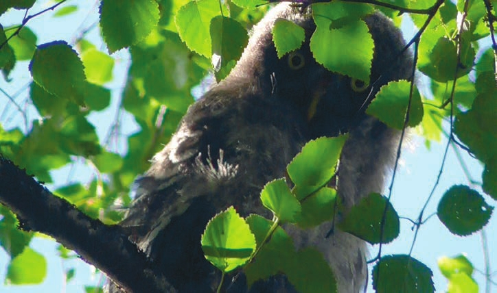 Хриплый крик повторился, и мы, приблизившись, увидели сидевшего в кроне березы совенка. Взрослых бородатых неясытей мне приходилось ранее видеть в неволе, но с совенком я познакомился впервые. Обычно совята выглядят милыми пушистыми шариками с огромными трогательными глазами, но этот подросток был скорее смешным и уродливым. Обтекаемая форма и крупные размеры бородатой неясыти создаются пышным оперением, и совенок, уже теряющий пух, но еще толком не оперенный, выглядел странно — с огромным клювом и выпученными глазами на неожиданно маленькой голове. Замолчав, совенок начал рассматривать нас, прячась за стволом березы. Другой птенец, сидевший немного выше, выглядывал из листвы.