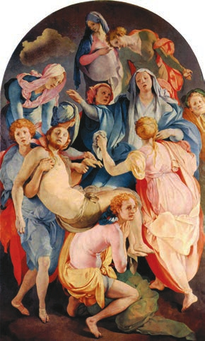 Фигуры несущих тело Христово у Понтормо исполнены в неожиданно светлых тонах и кажутся летящими по воздуху; в особенности это касается фигуры юноши слева в первом ряду. Справа на заднем плане видно лицо Иосифа Аримафейского, которому, как считается, Понтормо придал свои черты.