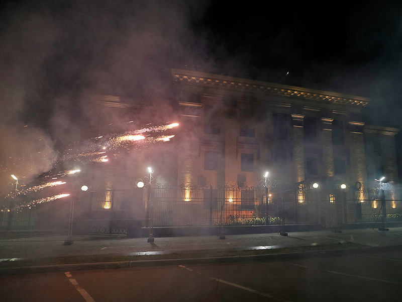 Нападавшие закидали территорию дипломатического представительства дымовыми шашками и стреляли из батареи салютов. "В результате имуществу Российской Федерации был причинен материальный ущерб", - подчеркнул Маркин.